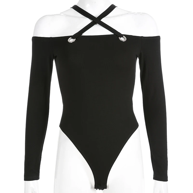Images of Elegant Off Shoulder Jumpsuit Ladies Black Romper Sexy Bandage Women Bodysuit Long Sleeve Casual Body Femme :